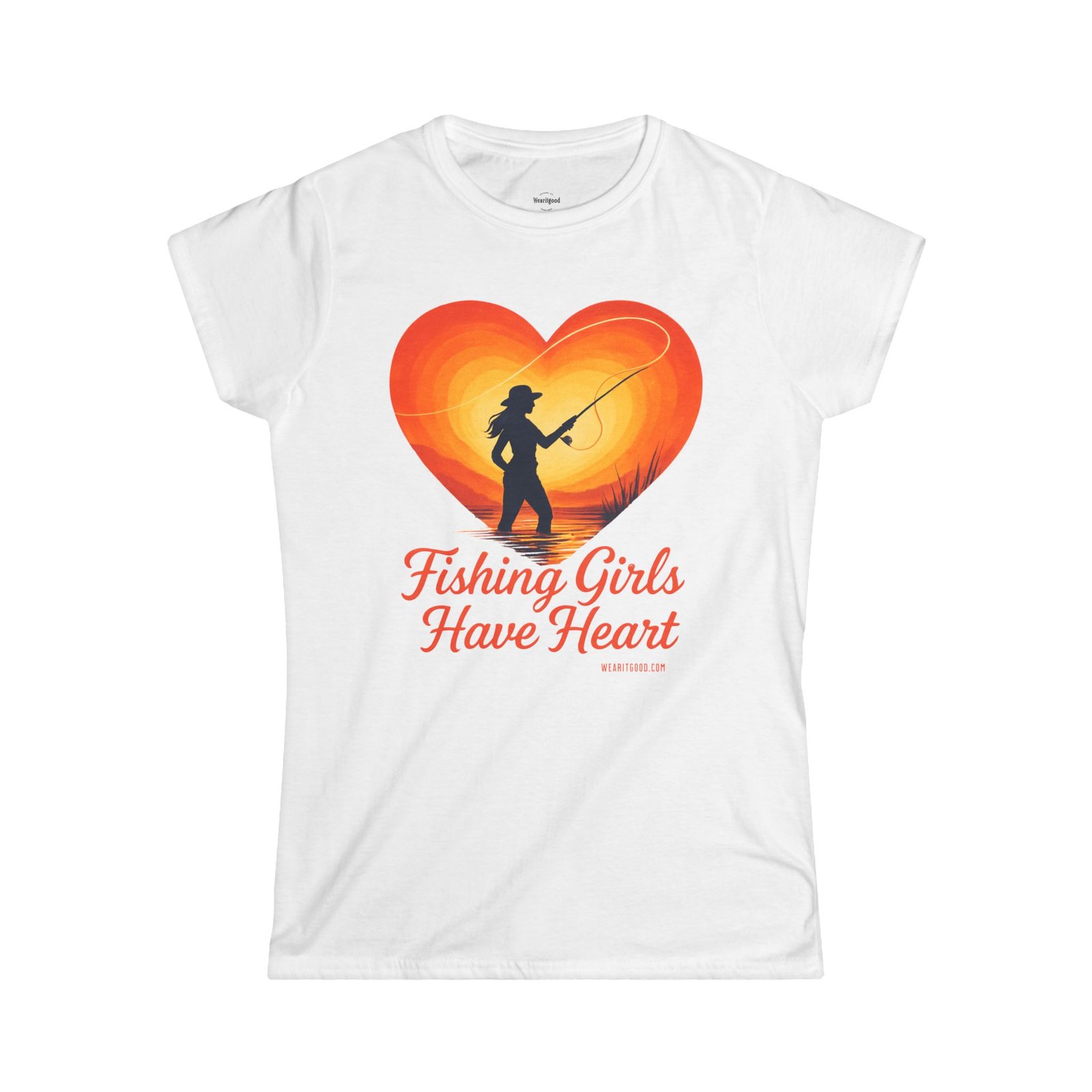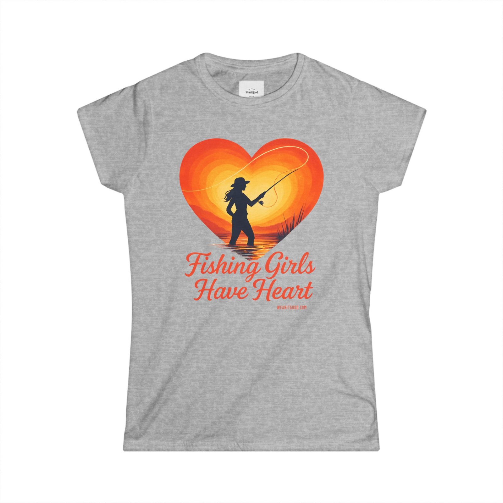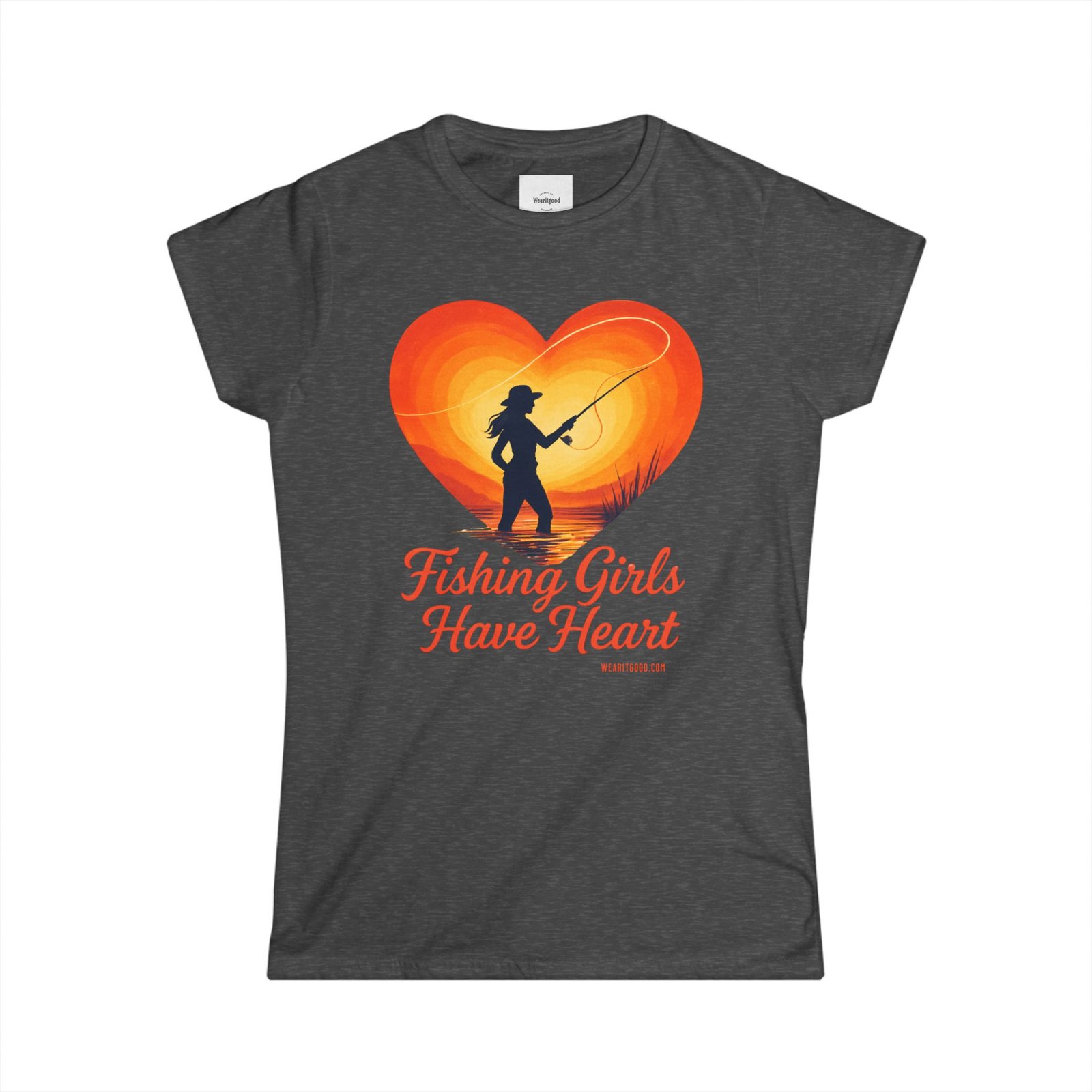Fishing Girls Have Heart soft, sun-warmed cotton meets quiet mornings on the water. This slim, semi-fitted tee carries a warm, retro heart graphic with a silhouette of a woman casting a line — a gentle nod to the slow, steady joy of fishing. It sits close enough to layer under a flannel or wear alone while you untangle line, laugh with friends at the dock, or sip coffee before the first cast. The light fabric drapes comfortably, keeping you cool during long, golden-hour sessions. Subtle details like a ribbed collar and side seams mean this shirt keeps its shape wash after wash, while the tear-away label stays out of the way during long days outdoors. Wear it to feel connected to quiet rivers, early sun, and the steady rhythm of reeling in what matters.