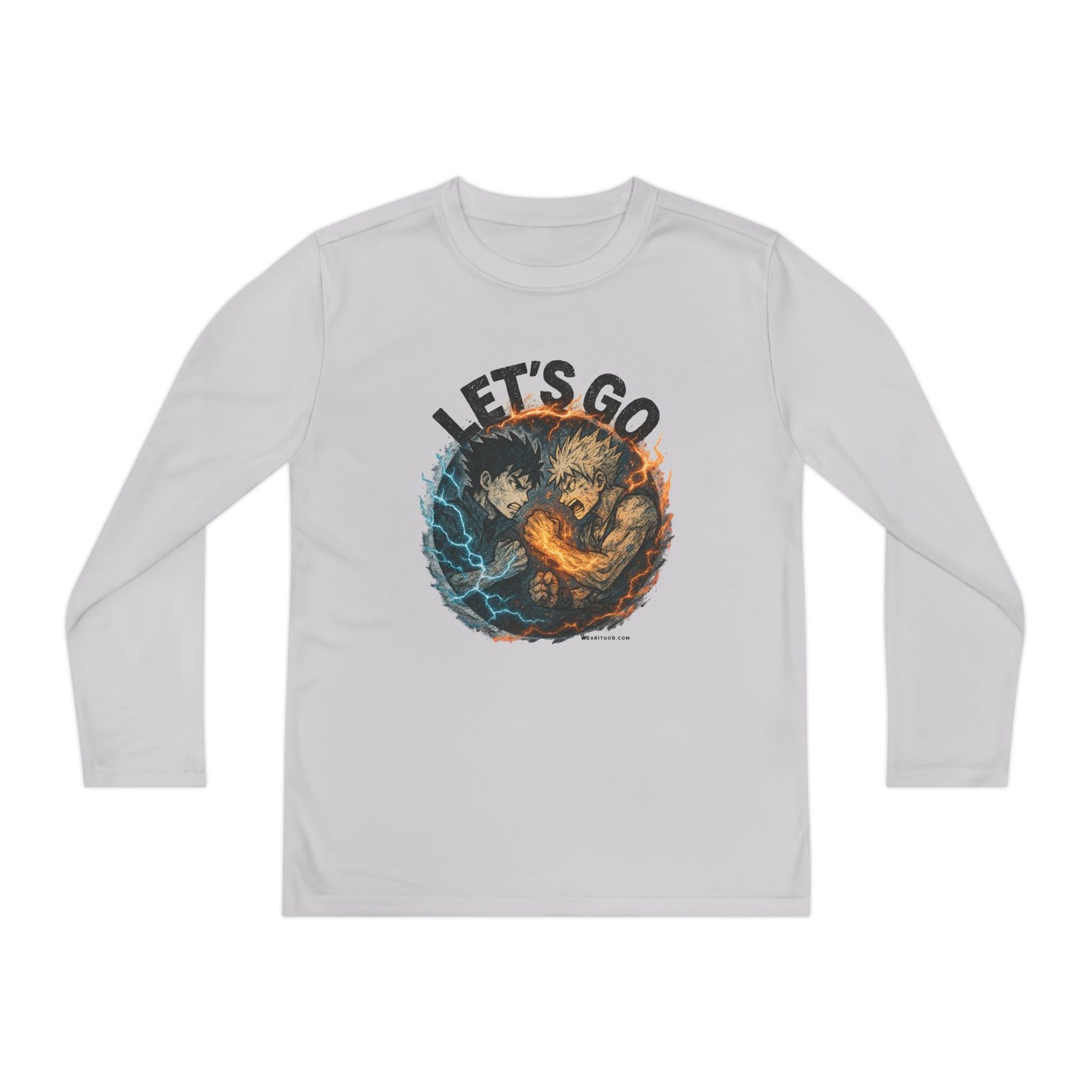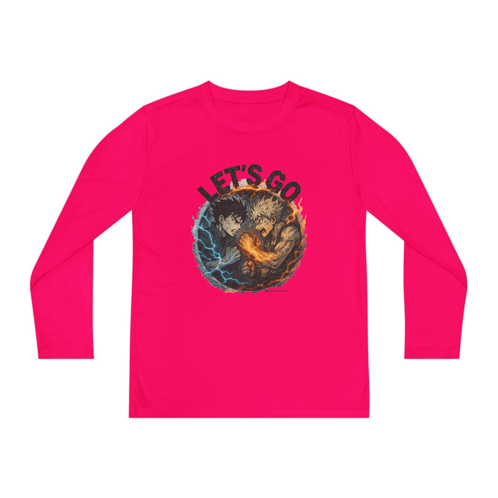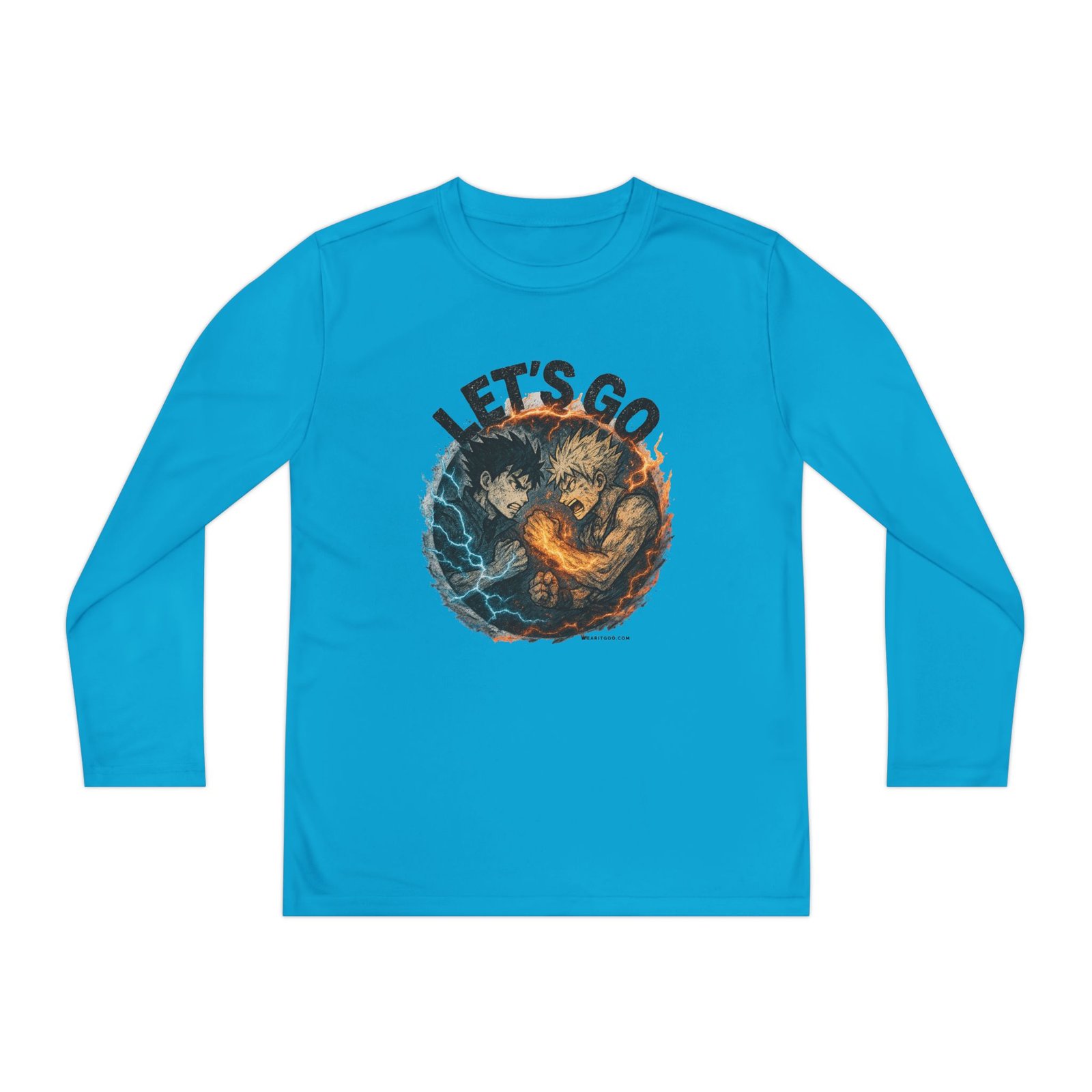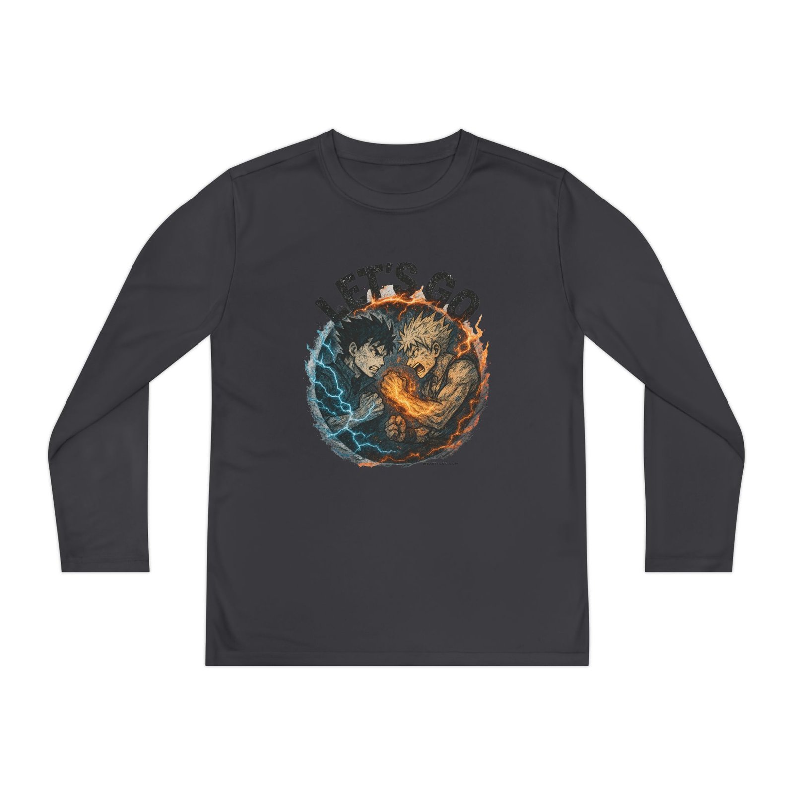 Let’s Go Anime Battle lightweight and built for motion, this youth long sleeve brings energy to every game and practice. The athletic cut moves with young players while moisture-wicking polyester pulls sweat away so they stay cool and focused. A bold, action-packed graphic sits front and center — fiery and electric elements collide under the rallying words “LET’S GO” — adding confidence and team spirit. Soft to the touch, barely there fabric makes it easy to layer under jerseys or wear on its own during training sessions and weekend matches. It’s a spirited top that keeps kids comfortable through drills, sprints, and post-game high-fives.