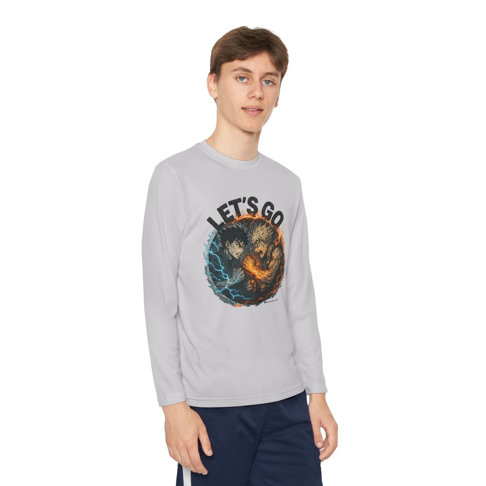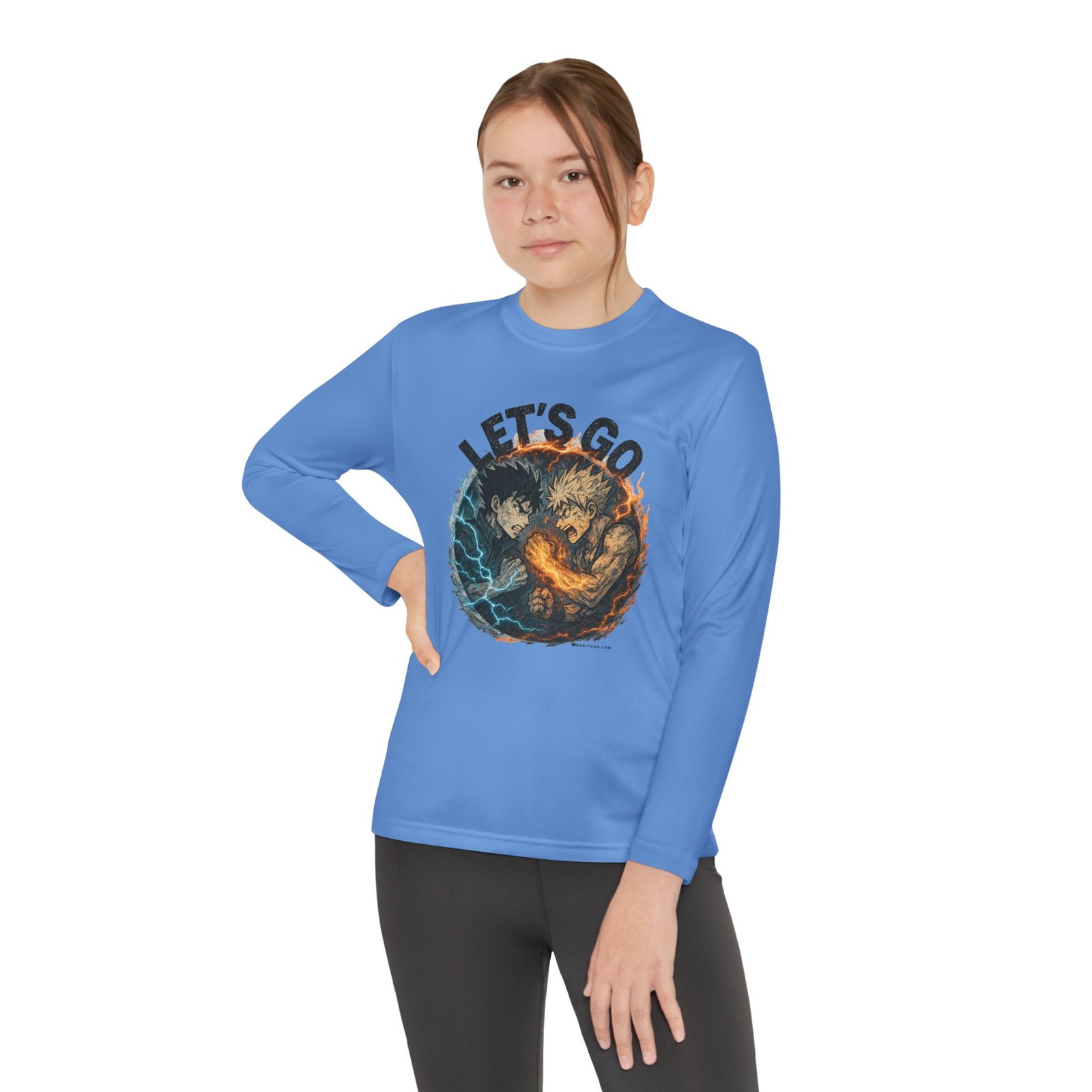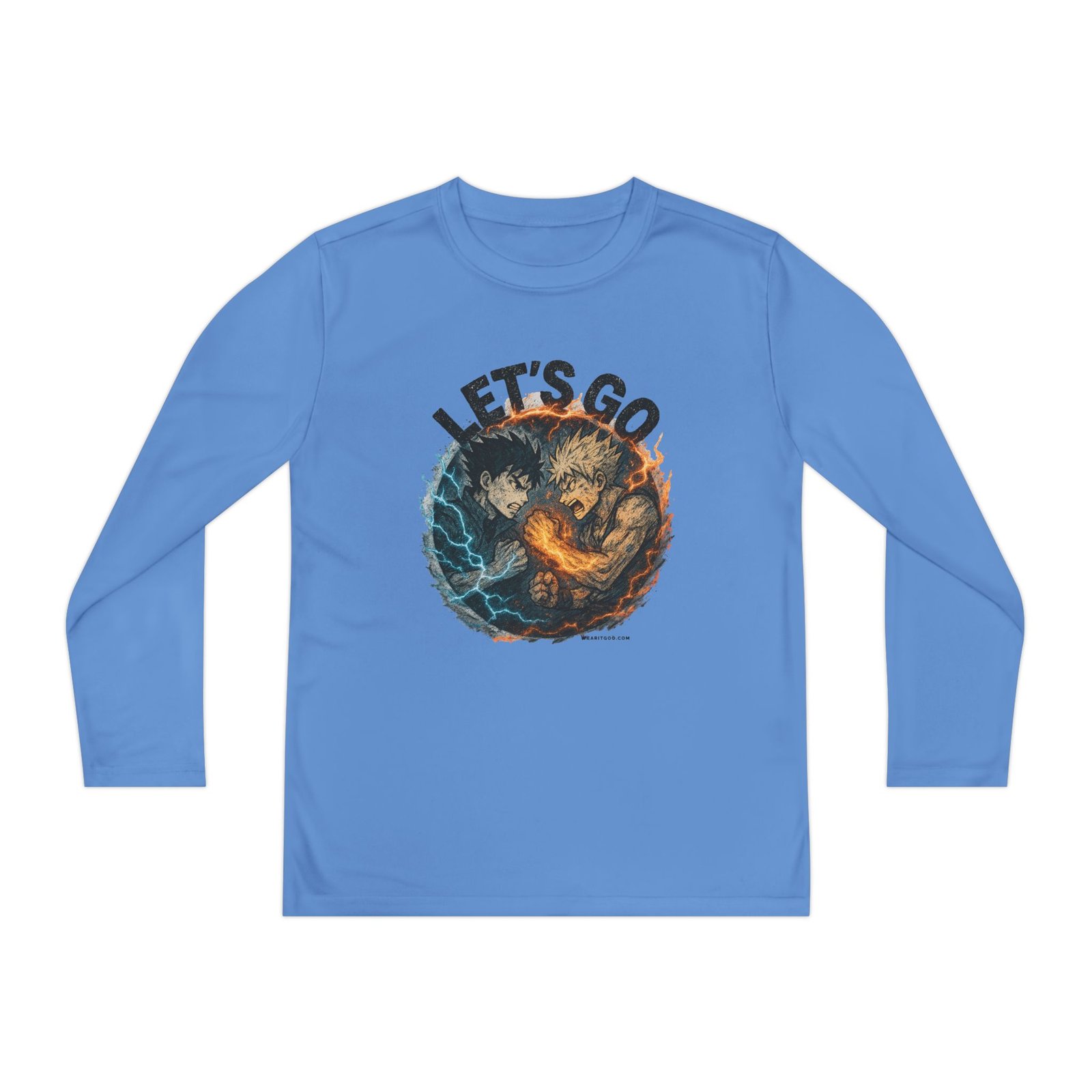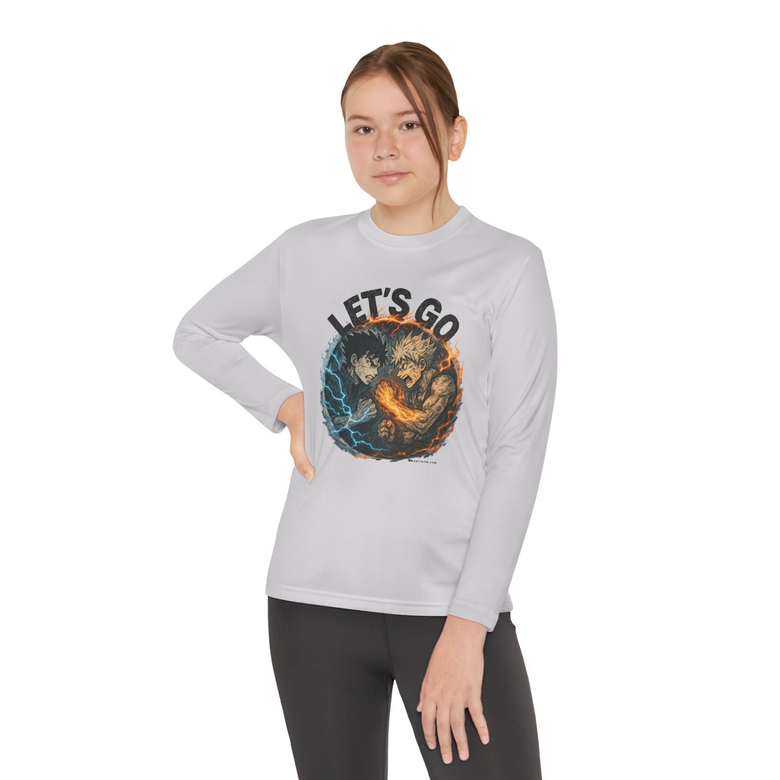 Let’s Go Anime Battle lightweight and built for motion, this youth long sleeve brings energy to every game and practice. The athletic cut moves with young players while moisture-wicking polyester pulls sweat away so they stay cool and focused. A bold, action-packed graphic sits front and center — fiery and electric elements collide under the rallying words “LET’S GO” — adding confidence and team spirit. Soft to the touch, barely there fabric makes it easy to layer under jerseys or wear on its own during training sessions and weekend matches. It’s a spirited top that keeps kids comfortable through drills, sprints, and post-game high-fives.