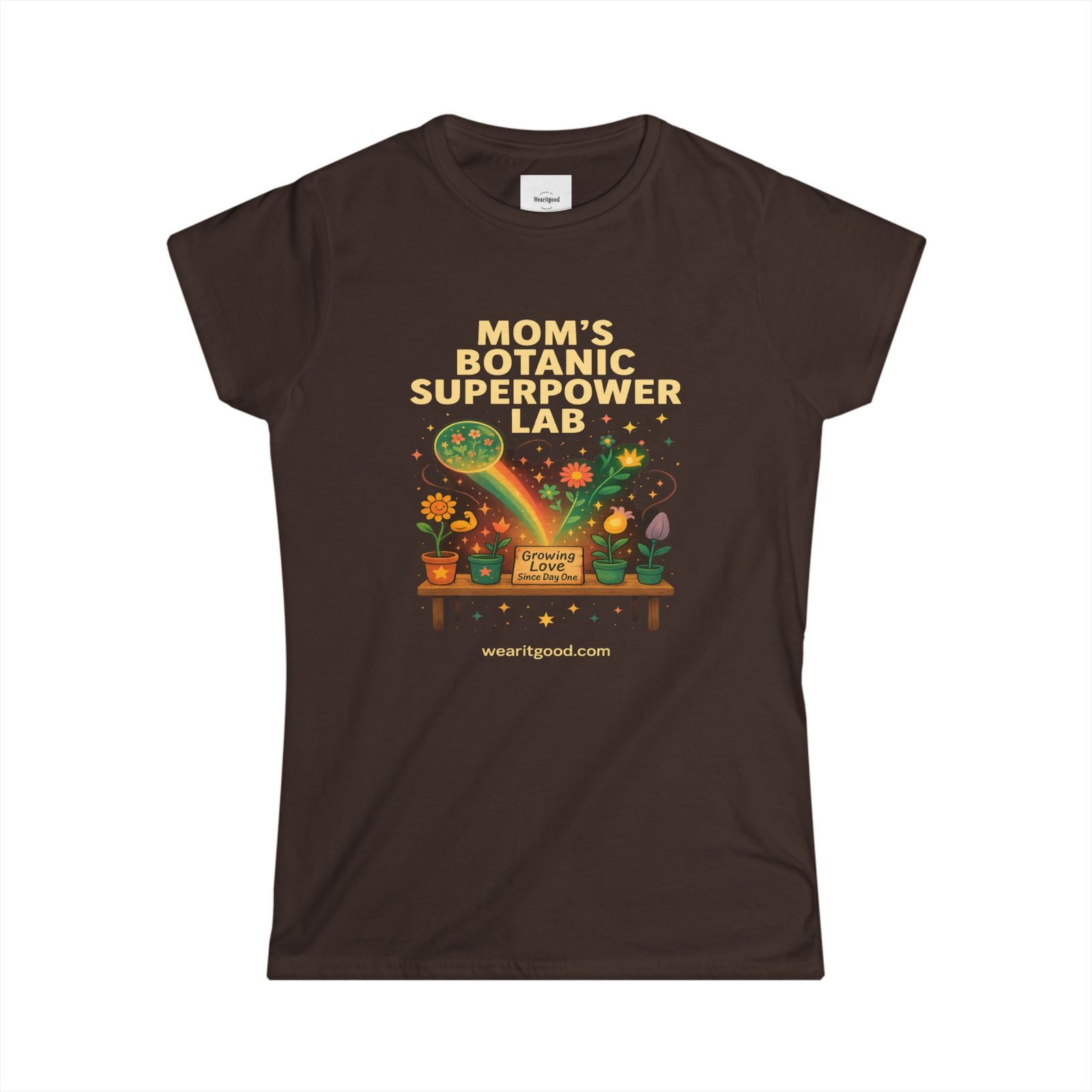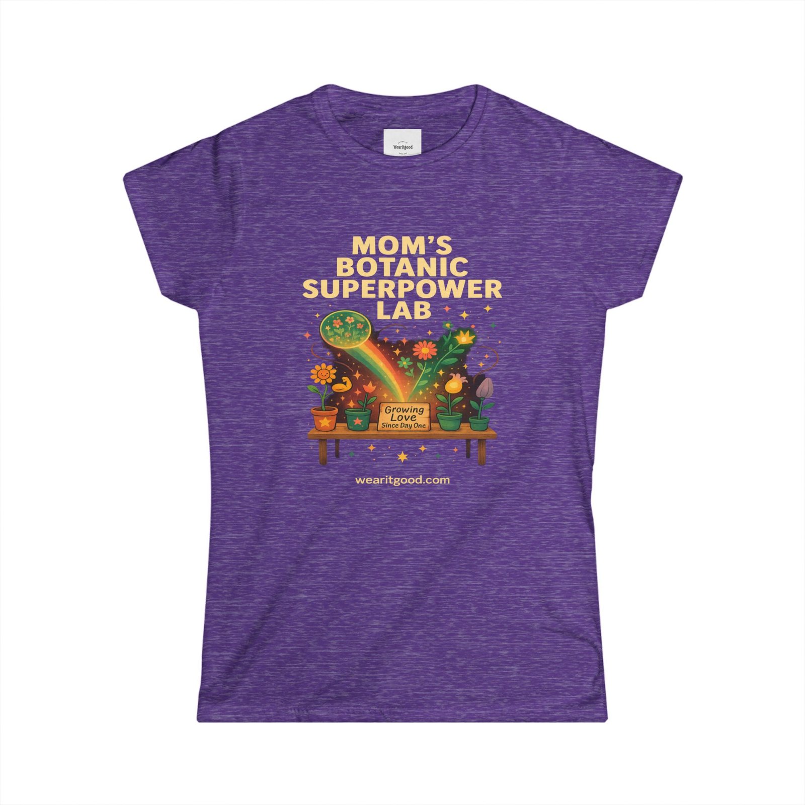 Mother’s Day soft, semi-fitted tee brings a playful, green-thumbed energy to everyday wear. The front art reads “Mom’s Botanic Superpower Lab” above a warm, illustrated potting bench—potted plants, watering cans, glowing leaves, and little gardening tools creating a cozy, workshop vibe. Lightweight ringspun cotton and a tear-away label keep the shirt comfortable for long afternoons of repotting, plant swaps, or casual errands. The ribbed collar and shoulder tape help it hold shape wash after wash, while side seams and double-needle hems keep the silhouette tidy and durable. Wear it to gardening meetups, weekend plant runs, or relaxed family gatherings—this tee feels like the soft companion of someone who finds joy in nurture and growth.