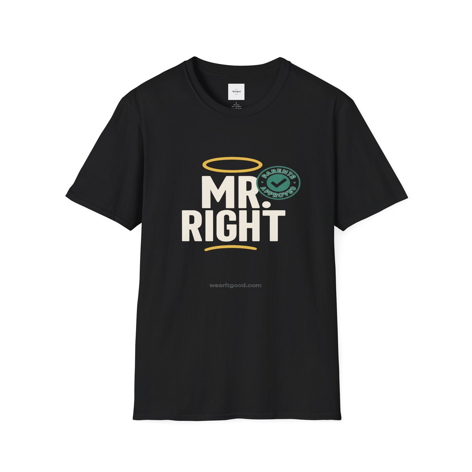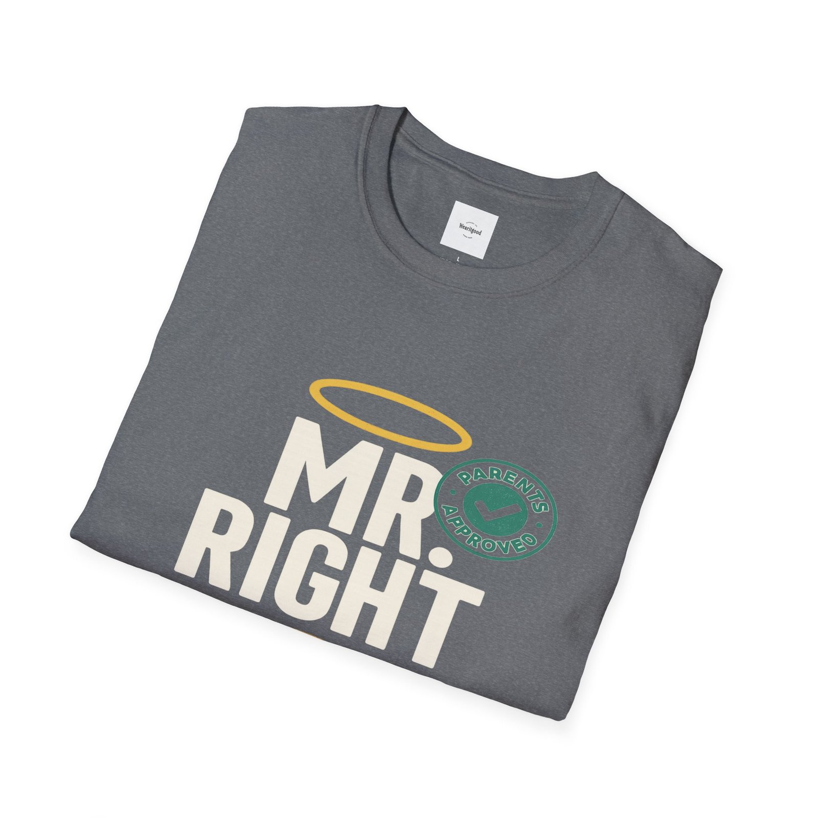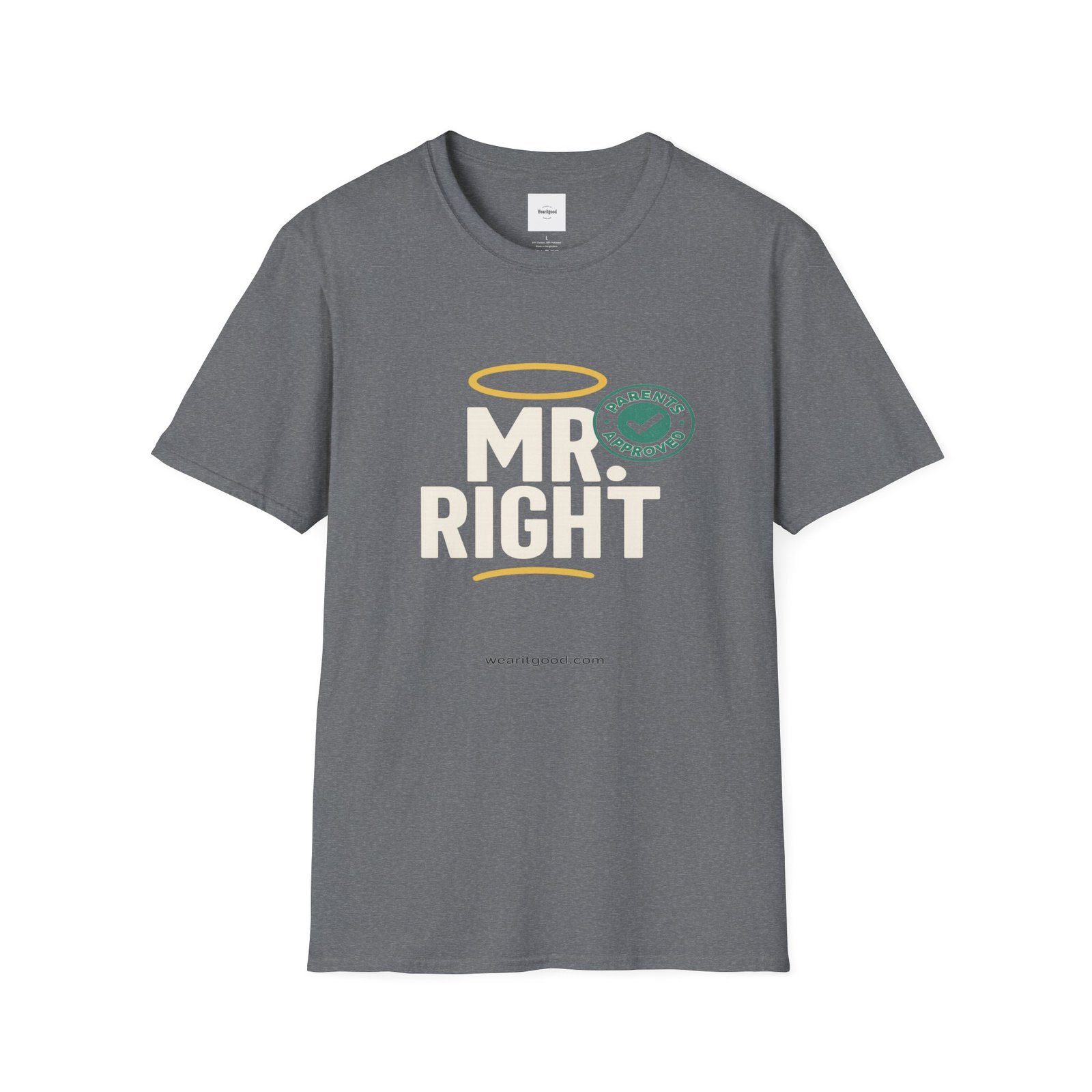 This lightweight crewneck tee carries a playful, confident vibe — the bold “MR RIGHT” lettering, halo motif and small emblem read like a wink from someone sure of themselves. Soft, smooth ring-spun cotton feels easy against the skin and drapes cleanly in the classic fit. Wear it with jeans for a relaxed date-night look, layer under a jacket for a casual office day, or pack it for weekend travel — it’s comfortable, low-fuss, and made to keep its shape through repeated wear. The subtle natural fleck option and durable print methods preserve the design’s character while staying breathable and comfortable all year round.